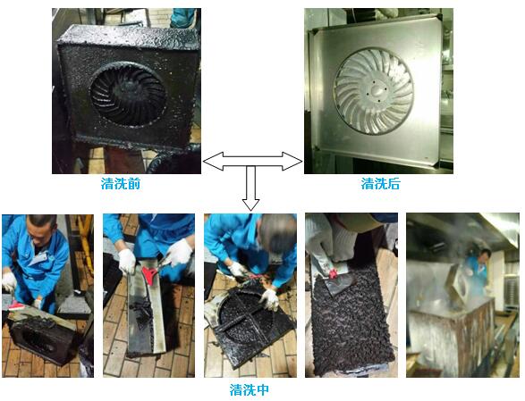清洗范圍:油網(wǎng)、油煙管、排煙罩、煙道、風機、灶臺、油煙凈化器等